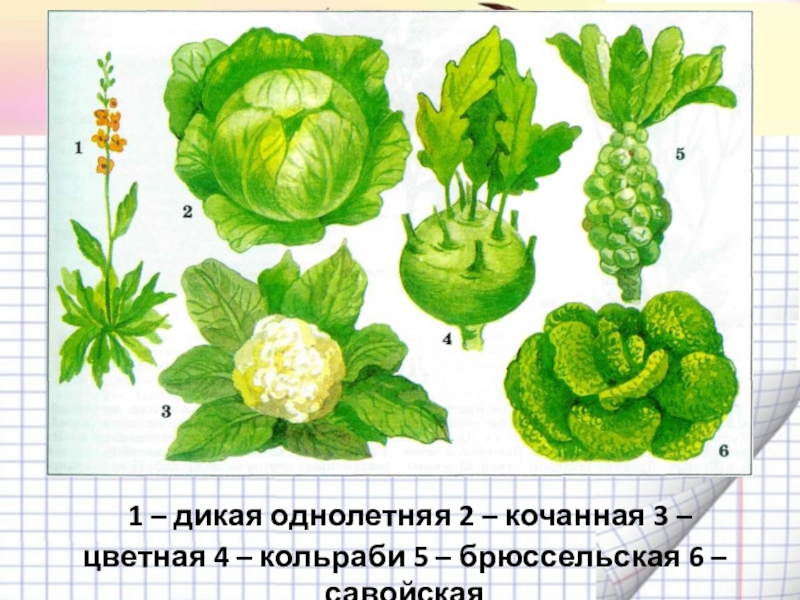 1 – дикая однолетняя 2 – кочанная 3 – цветная 4 – кольраби 5 – брюссельская 6 – савойская