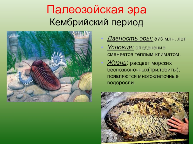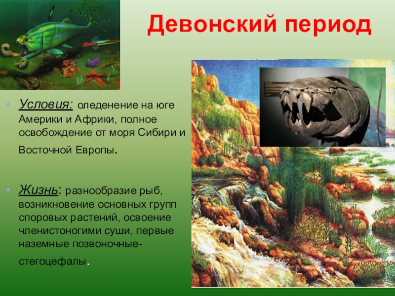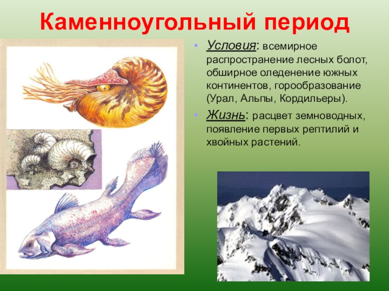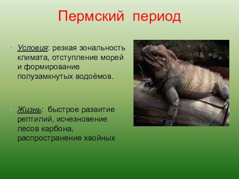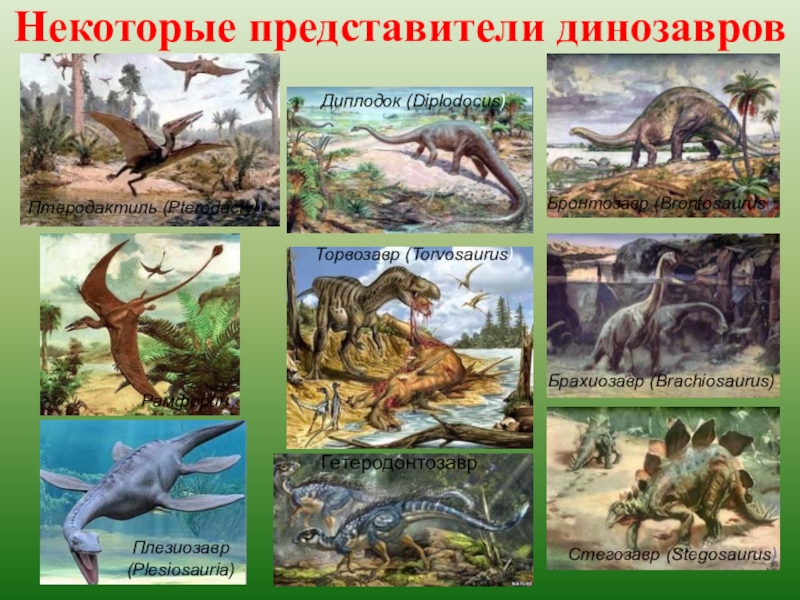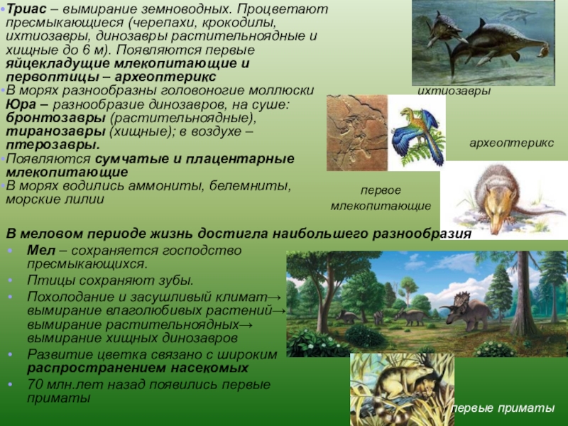 Триас – вымирание земноводных. Процветают пресмыкающиеся (черепахи, крокодилы, ихтиозавры, динозавры растительноядные и хищные до 6 м). Появляются первые яйцекладущие млекопитающие и первоптицы – археоптерикс