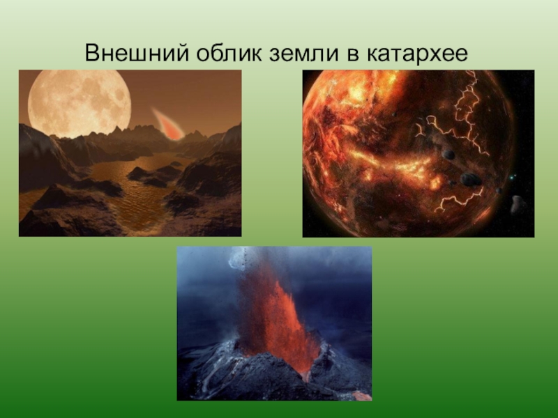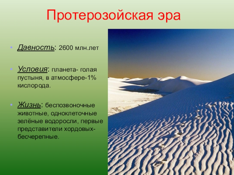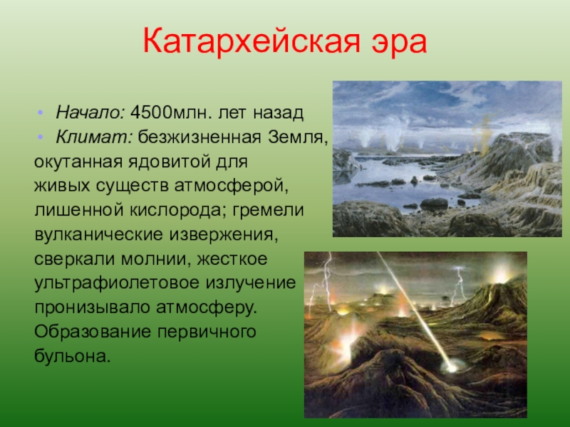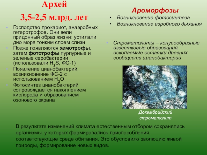 Господство прокариот, анаэробных гетеротрофов. Они вели придонный образ жизни: устилали дно моря тонким слоем слизи