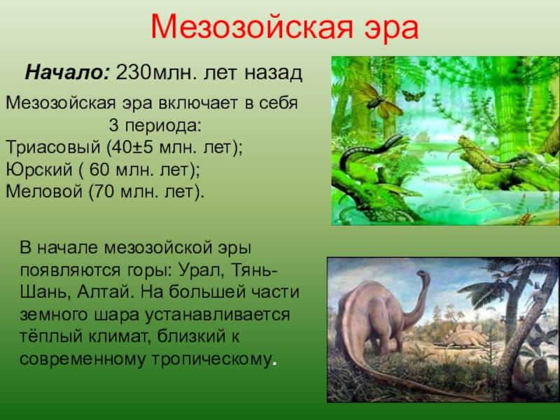 В начале мезозойской эры появляются горы: Урал, Тянь-Шань, Алтай. На большей части земного шара устанавливается тёплый климат, близкий к современному тропическому.