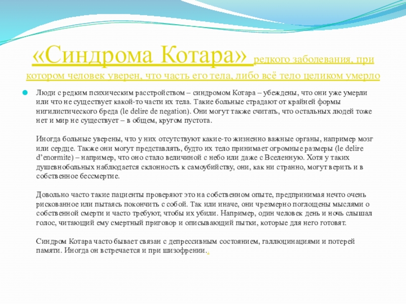 Синдром Котара часто бывает связан с депрессивным состоянием, галлюцинациями и потерей памяти. Иногда он встречается и при шизофрении..