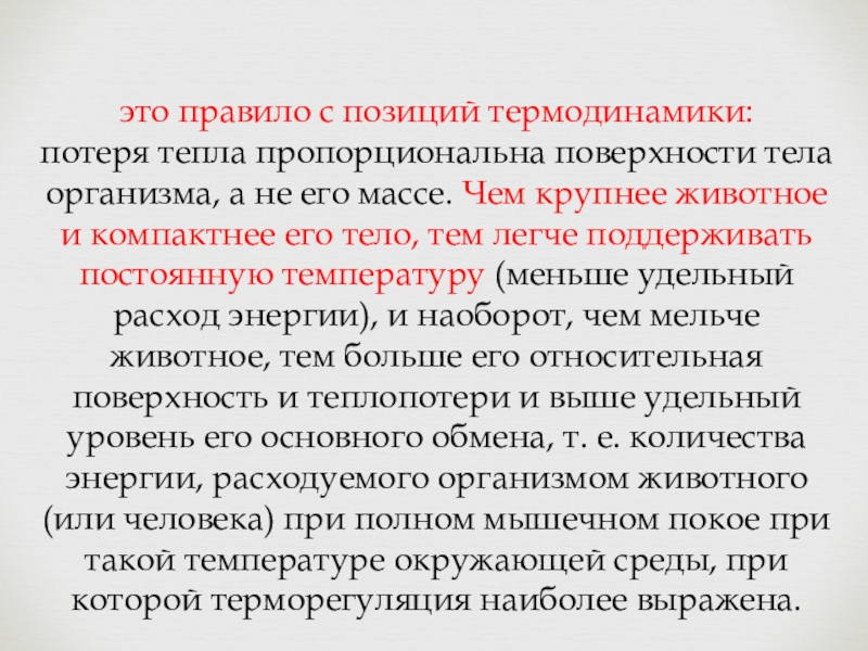 а не его массе. Чем крупнее животное и компактнее его тело, тем легче поддерживать постоянную температуру (меньше удельный расход энергии), и наоборот, чем мельче животное, тем больше его относительная поверхность и теплопотери и выше удельный уровень его основного обмена, т. е. количества энергии, расходуемого организмом животного (или человека) при полном мышечном покое при такой температуре окружающей среды, при которой терморегуляция наиболее выражена.