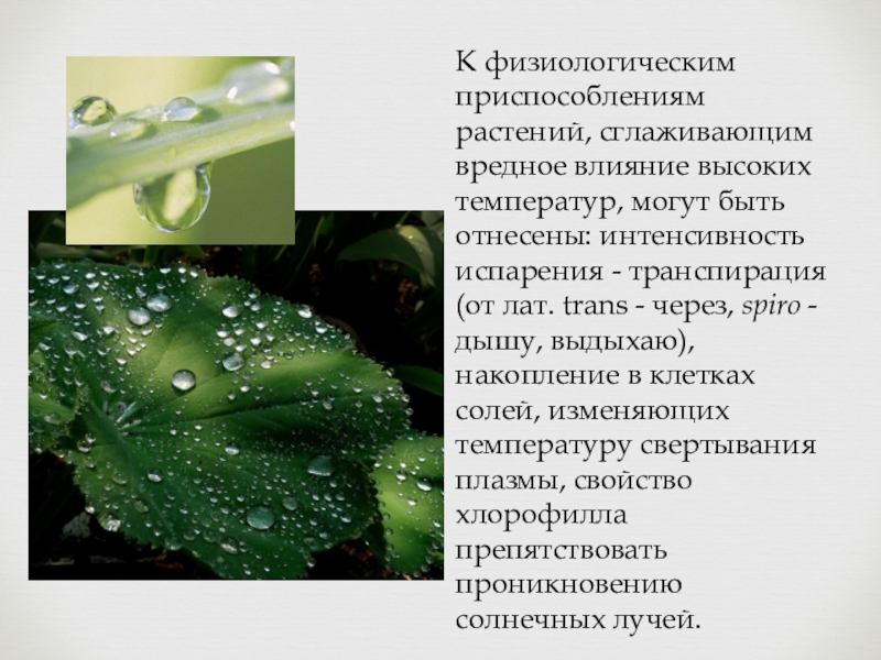 Слайд 5К физиологическим приспособлениям растений, сглаживающим вредное влияние высоких температур, могут быть