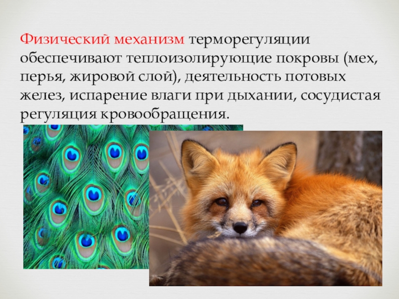 Слайд 12Физический механизм терморегуляции обеспечивают теплоизолирующие покровы (мех, перья, жировой слой), деятельность