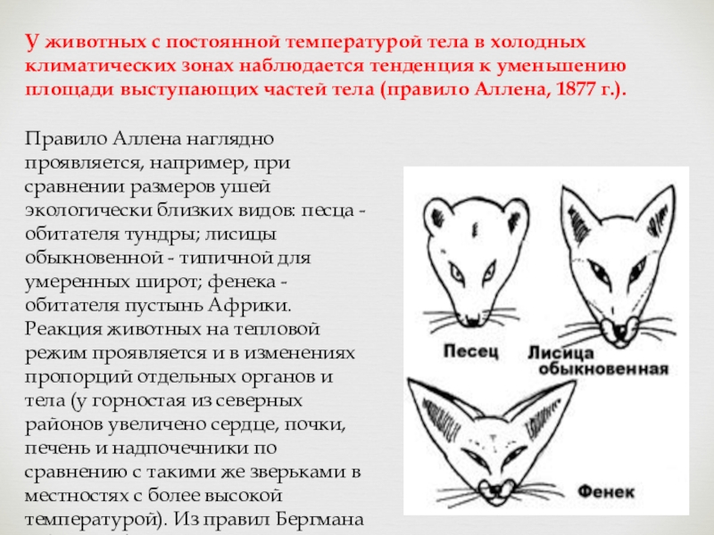 У животных с постоянной температурой тела в холодных климатических зонах наблюдается тенденция к уменьшению площади выступающих частей тела (правило Аллена, 1877 г.).