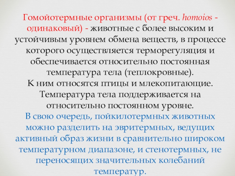 Слайд 10Гомойотермные организмы (от греч. homoios - одинаковый) - животные с более