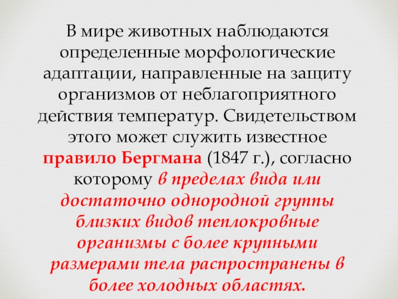 от неблагоприятного действия температур. Свидетельством этого может служить известное правило Бергмана (1847 г.), согласно которому в пределах вида или достаточно однородной группы близких видов теплокровные организмы с более крупными размерами тела распространены в более холодных областях.