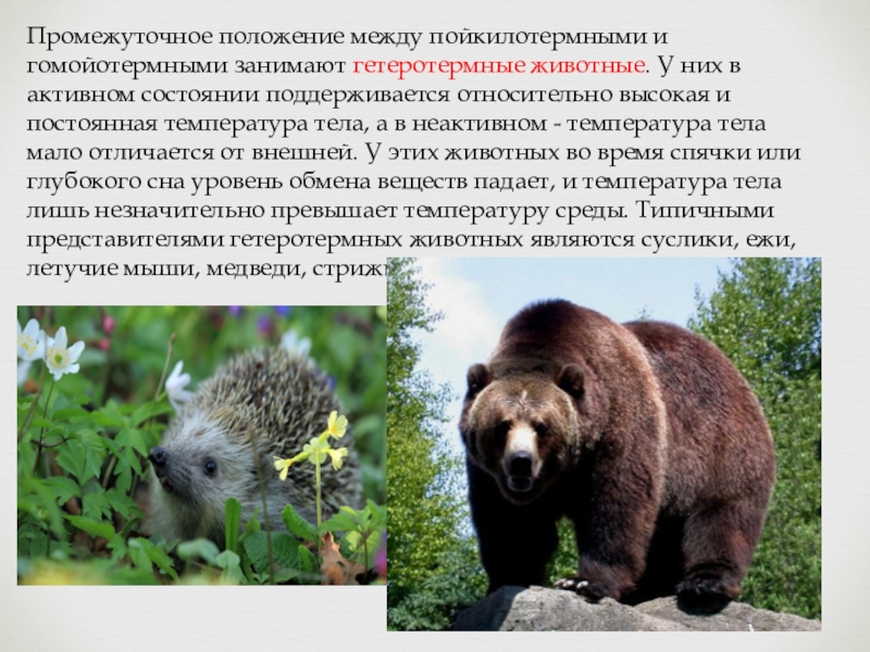 в активном состоянии поддерживается относительно высокая и постоянная температура тела, а в неактивном - температура тела мало отличается от внешней. У этих животных во время спячки или глубокого сна уровень обмена веществ падает, и температура тела лишь незначительно превышает температуру среды. Типичными представителями гетеротермных животных являются суслики, ежи, летучие мыши, медведи, стрижи, утконосы, ехидны, кенгуру.