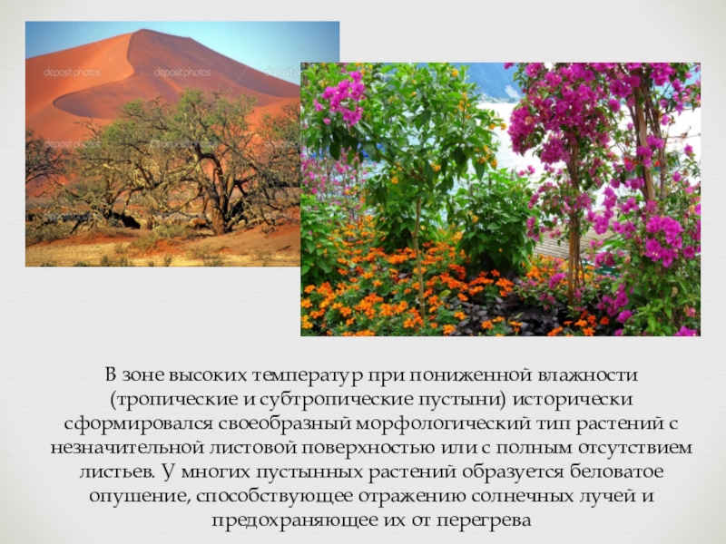 исторически сформировался своеобразный морфологический тип растений с незначительной листовой поверхностью или с полным отсутствием листьев. У многих пустынных растений образуется беловатое опушение, способствующее отражению солнечных лучей и предохраняющее их от перегрева