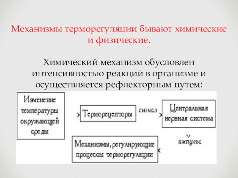 Слайд 11Механизмы терморегуляции бывают химические и физические.