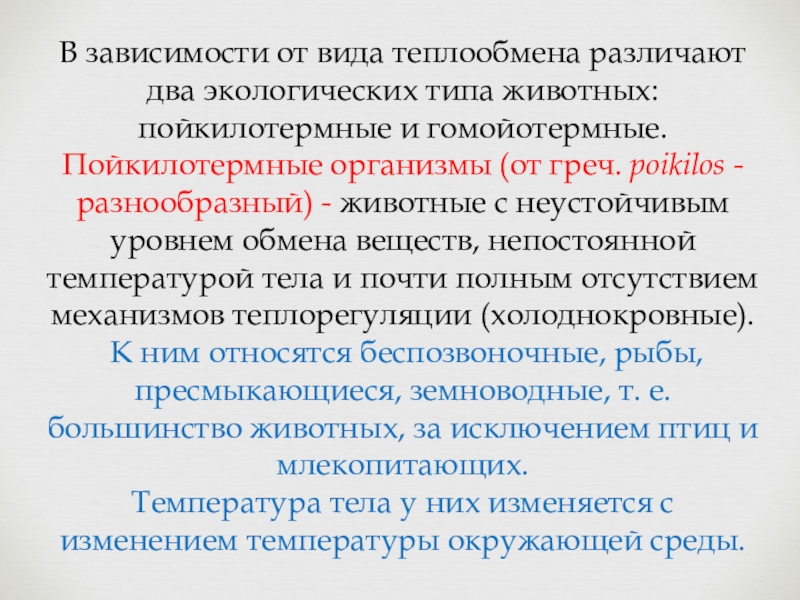 Слайд 9В зависимости от вида теплообмена различают два экологических типа животных: пойкилотермные
