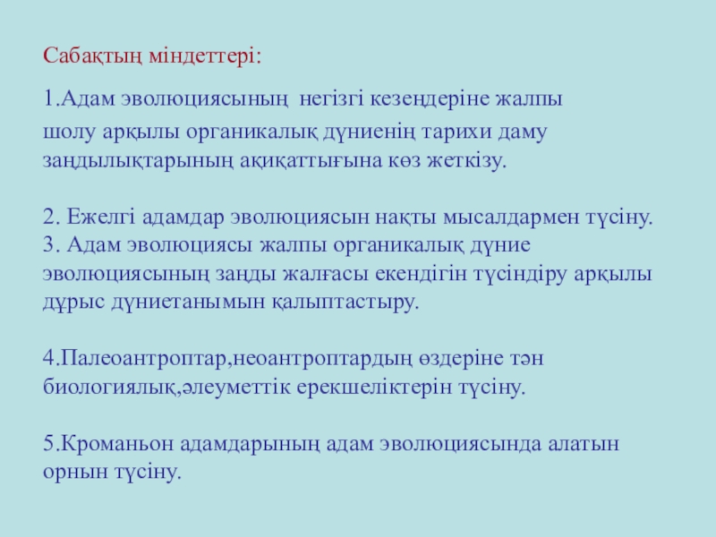 3. Адам эволюциясы жалпы органикалық дүние эволюциясының заңды жалғасы екендігін түсіндіру арқылы дұрыс дүниетанымын қалыптастыру.