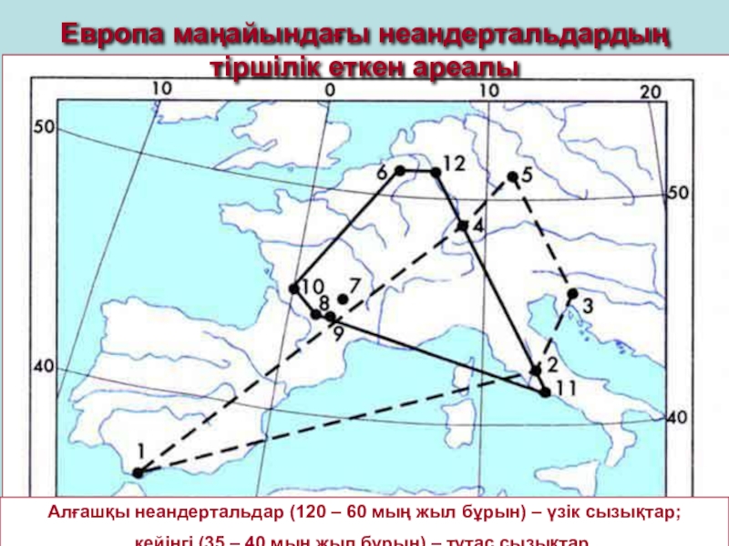 Слайд 23Алғашқы неандертальдар (120 – 60 мың жыл бұрын) – үзік сызықтар;