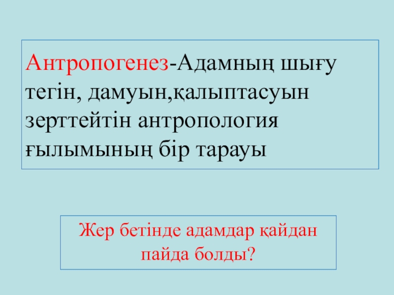 Слайд 3Антропогенез-Адамның шығу тегін, дамуын,қалыптасуын зерттейтін антропология ғылымының бір тарауы