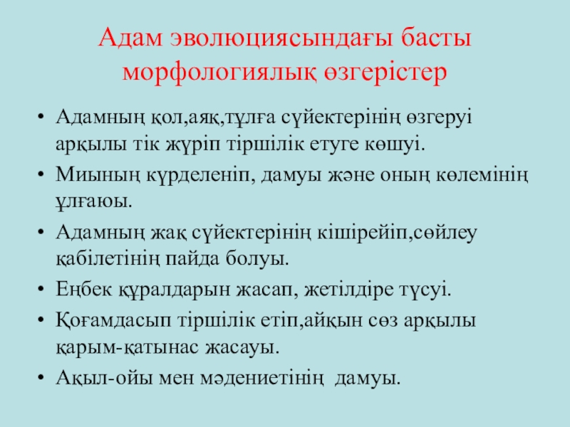 Слайд 27Адам эволюциясындағы басты морфологиялық өзгерістер