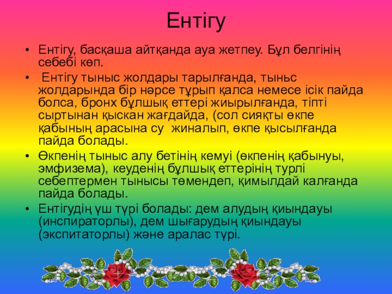 Ентiгудiң үш түрi болады: дем алудың қиындауы (инспираторлы), дем шығарудың қиындауы (экспитаторлы) және аралас түрi.