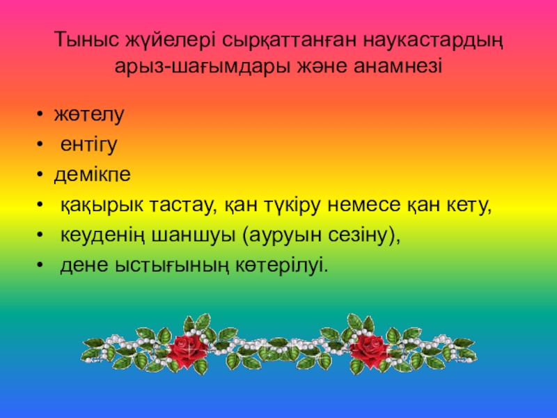 Слайд 12Тыныс жүйелерi сырқаттанған наукастардың арыз-шағымдары және анамнезi