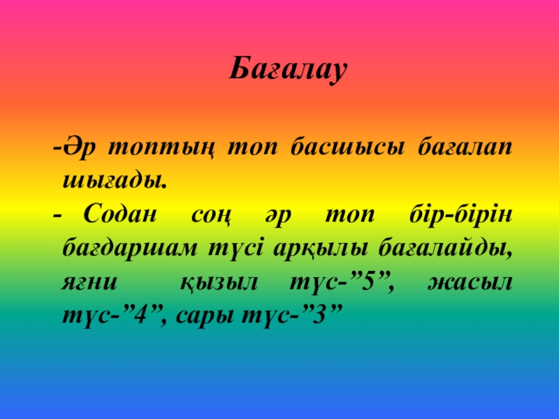 бағдаршам түсі арқылы бағалайды, яғни қызыл түс-”5”, жасыл түс-”4”, сары түс-”3”