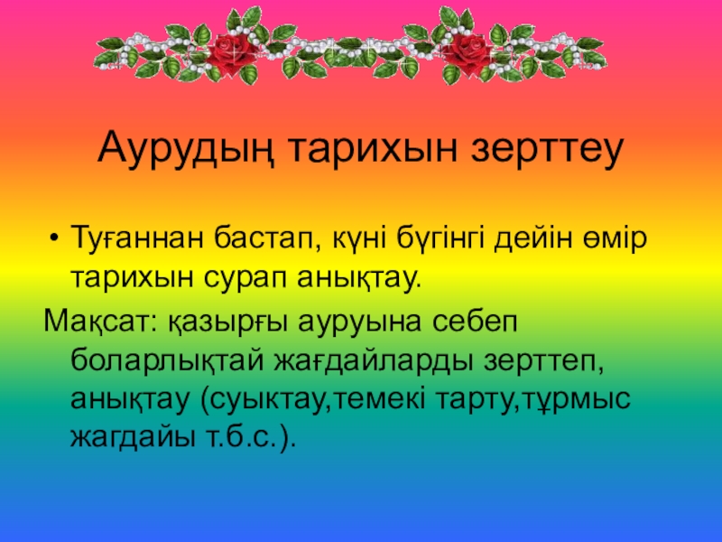 Мақсат: қазырғы ауруына себеп боларлықтай жағдайларды зерттеп, анықтау (суыктау,темекі тарту,тұрмыс жагдайы т.б.с.).
