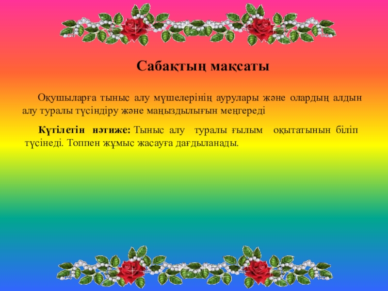 Күтілетін нәтиже: Тыныс алу туралы ғылым оқытатынын біліп түсінеді. Топпен жұмыс жасауға дағдыланады.