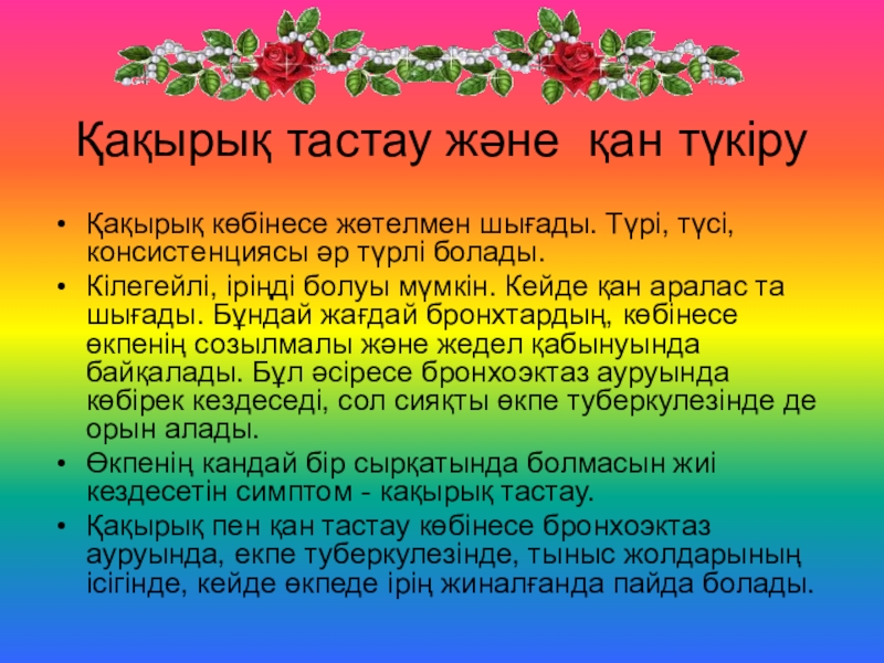 Өкпенiң кандай бiр сырқатында болмасын жиi кездесетiн симптом - кақырық тастау.