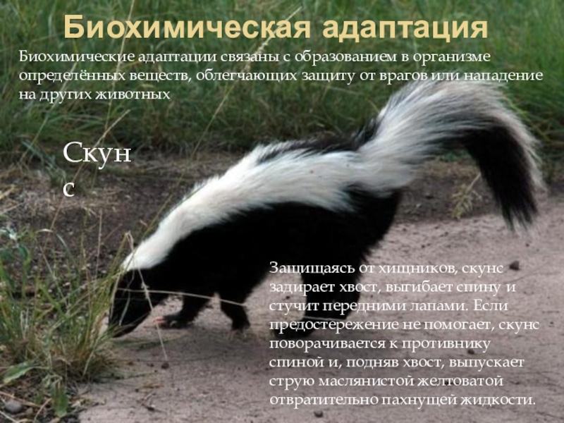 Защищаясь от хищников, скунс задирает хвост, выгибает спину и стучит передними лапами. Если предостережение не помогает, скунс поворачивается к противнику спиной и, подняв хвост, выпускает струю маслянистой желтоватой отвратительно пахнущей жидкости.
