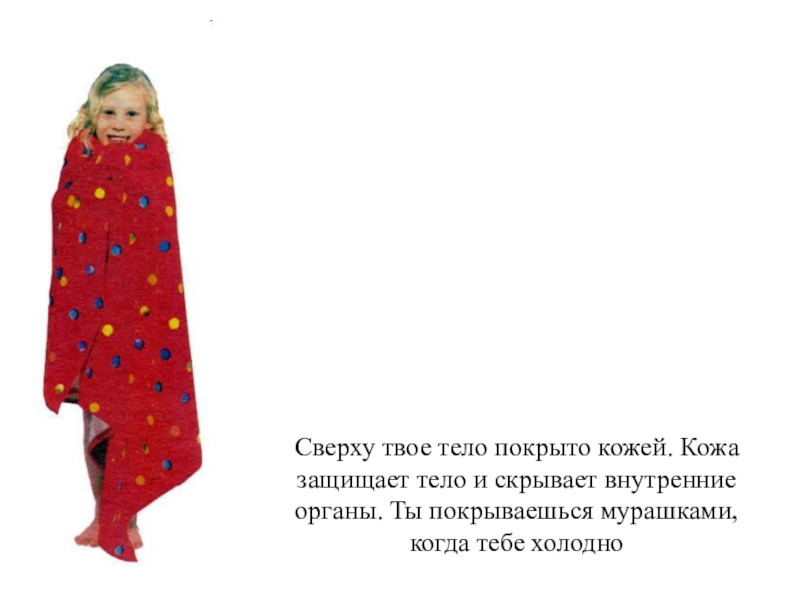 Сверху твое тело покрыто кожей. Кожа защищает тело и скрывает внутренние органы. Ты покрываешься мурашками,когда тебе холодно
