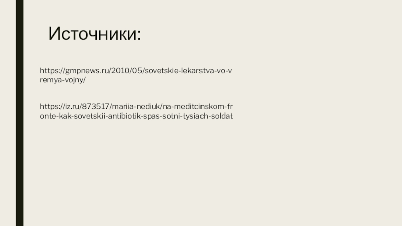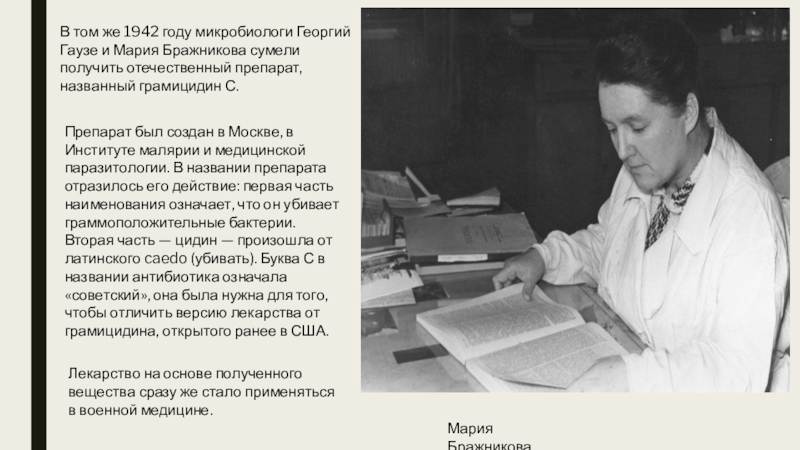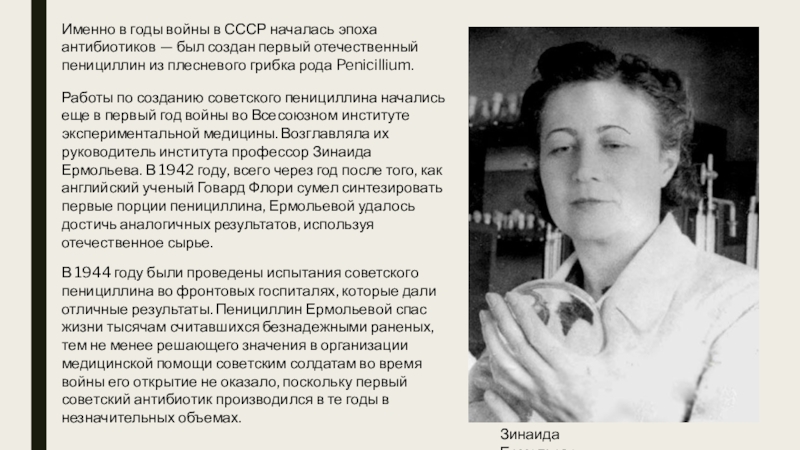 Работы по созданию советского пенициллина начались еще в первый год войны во Всесоюзном институте экспериментальной медицины. Возглавляла их руководитель института профессор Зинаида Ермольева. В 1942 году, всего через год после того, как английский ученый Говард Флори сумел синтезировать первые порции пенициллина, Ермольевой удалось достичь аналогичных результатов, используя отечественное сырье.