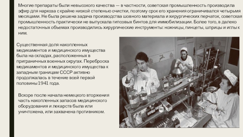 Вскоре после начала немецкого вторжения часть накопленных запасов медицинского оборудования и лекарств была или уничтожена, или захвачена противником.