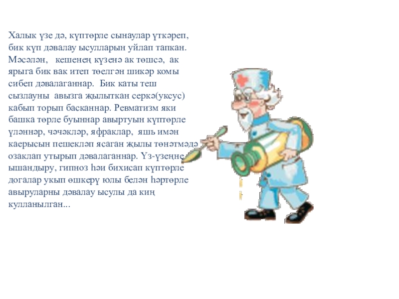 Слайд 4Халык үзе дә, күптөрле сынаулар үткәреп, бик күп дәвалау ысулларын уйлап