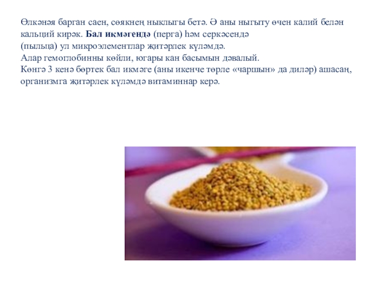 Слайд 10Өлкәнәя барган саен, сөякнең ныклыгы бетә. Ә аны ныгыту өчен калий белән кальций кирәк. Бал
