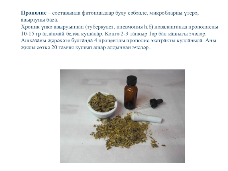Слайд 13Прополис – составында фитонцидлар булу сәбәпле, микробларны үтерә, авыртуны баса.