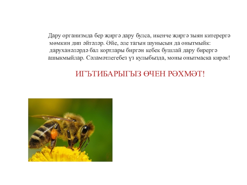 Слайд 16Дару организмда бер җиргә дару булса, икенче җиргә зыян китерергә