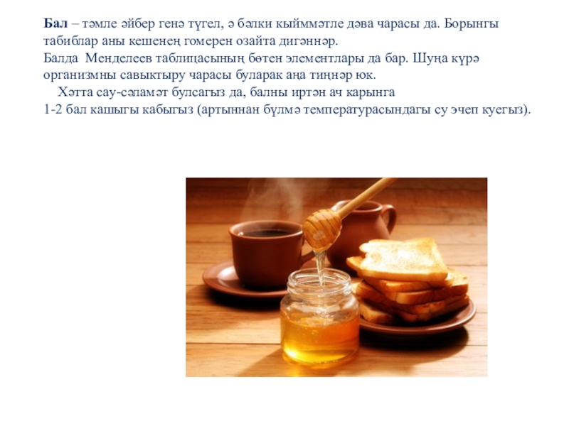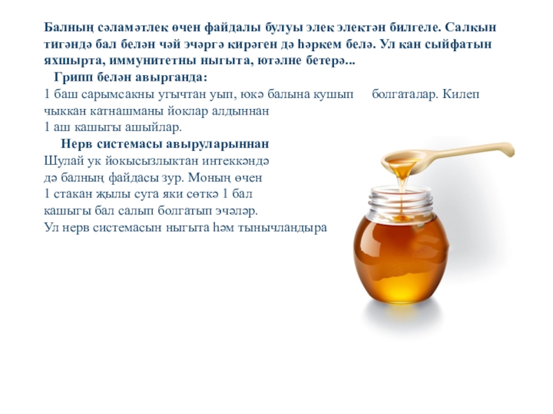 Слайд 11Балның сәламәтлек өчен файдалы булуы элек электән билгеле. Салкын тигәндә бал