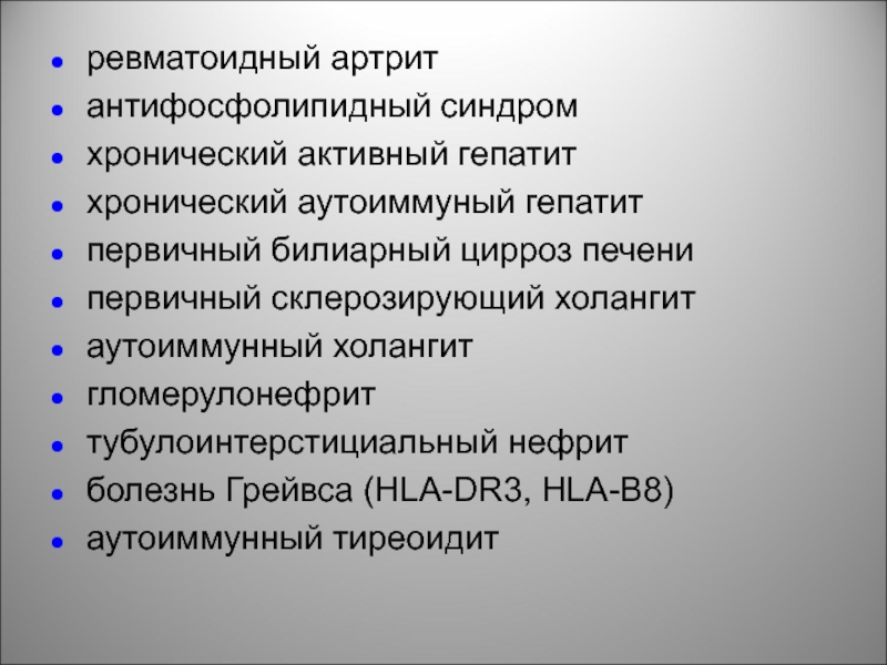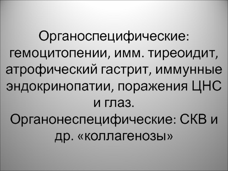 Слайд 7Органоспецифические: гемоцитопении, имм. тиреоидит, атрофический гастрит, иммунные эндокринопатии, поражения ЦНС и