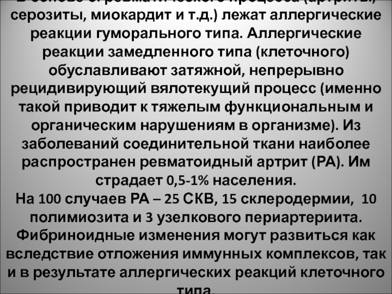 аллергические реакции гуморального типа. Аллергические реакции замедленного типа (клеточного) обуславливают затяжной, непрерывно рецидивирующий вялотекущий процесс (именно такой приводит к тяжелым функциональным и органическим нарушениям в организме). Из заболеваний соединительной ткани наиболее распространен ревматоидный артрит (РА). Им страдает 0,5-1% населения.