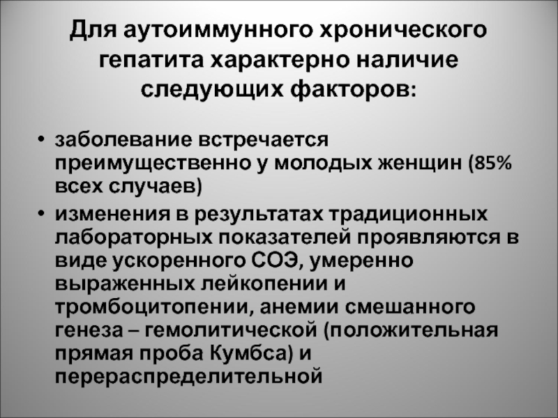 Слайд 15Для аутоиммунного хронического гепатита характерно наличие следующих факторов: