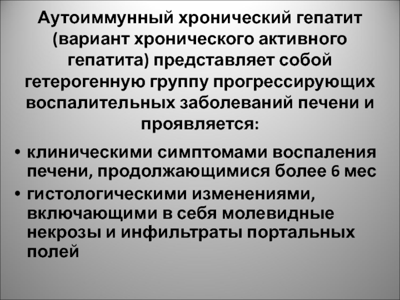 Слайд 14Аутоиммунный хронический гепатит (вариант хронического активного гепатита) представляет собой гетерогенную группу