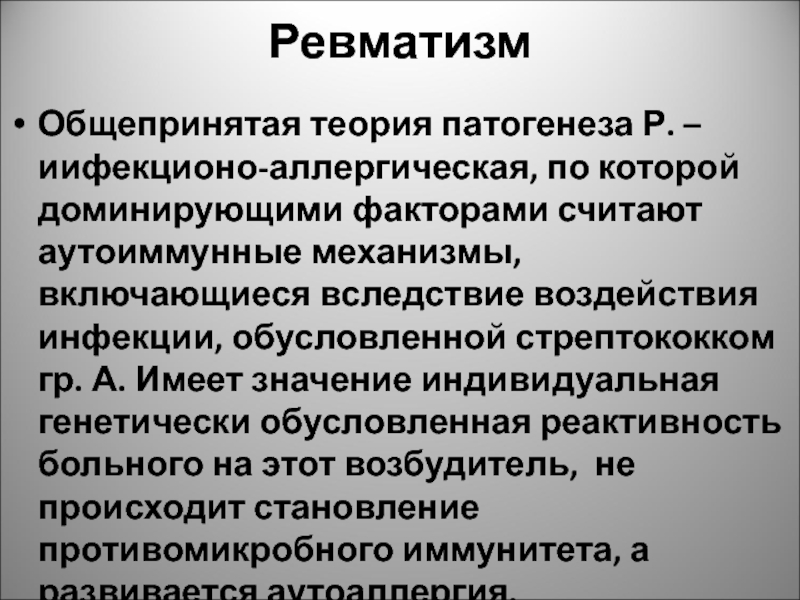 Общепринятая теория патогенеза Р. – иифекционо-аллергическая, по которой доминирующими факторами