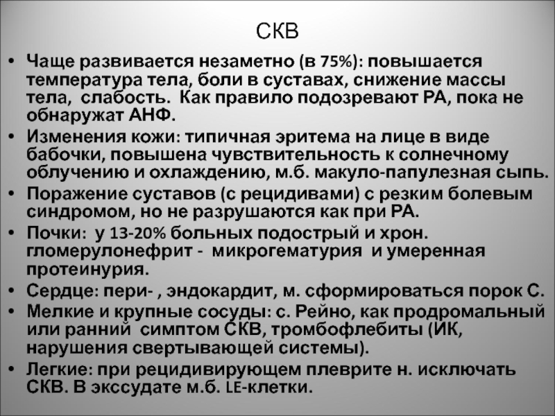 Легкие: при рецидивирующем плеврите н. исключать СКВ. В экссудате м.б. LE-клетки.