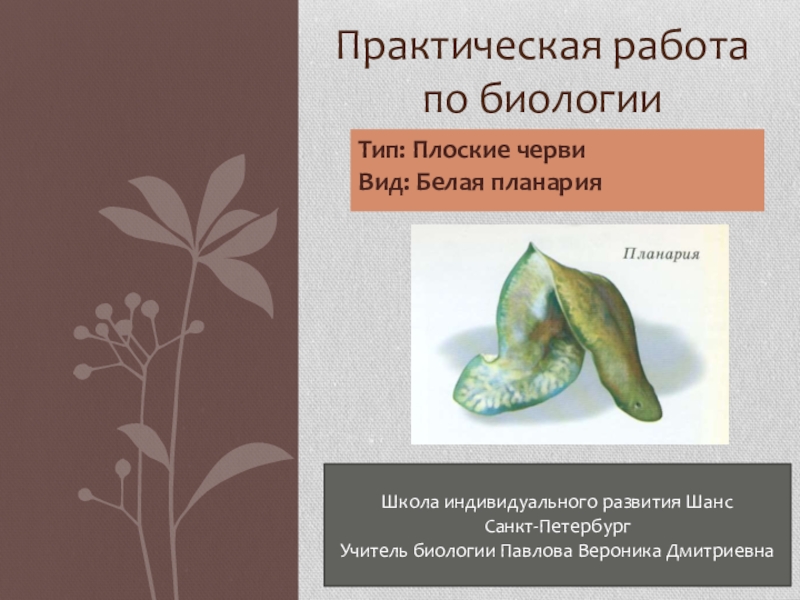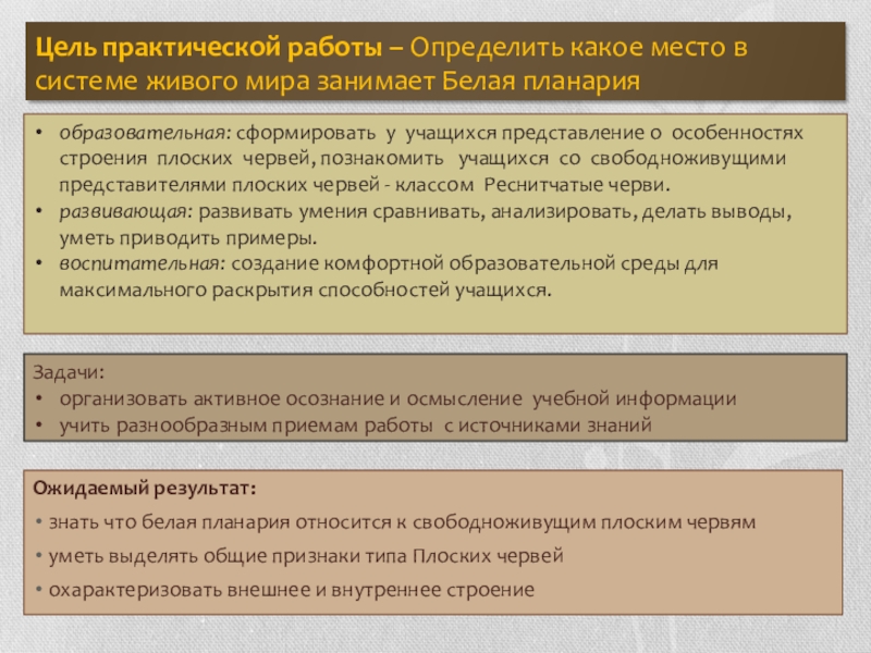 образовательная: сформировать у учащихся представление о особенностях строения плоских червей, познакомить учащихся со свободноживущими представителями плоских червей - классом Реснитчатые черви.