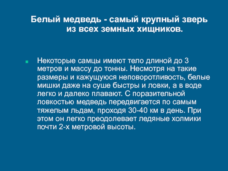 имеют тело длиной до 3 метров и массу до тонны. Несмотря на такие размеры и кажущуюся неповоротливость, белые мишки даже на суше быстры и ловки, а в воде легко и далеко плавают. С поразительной ловкостью медведь передвигается по самым тяжелым льдам, проходя 30-40 км в день. При этом он легко преодолевает ледяные холмики почти 2-х метровой высоты.