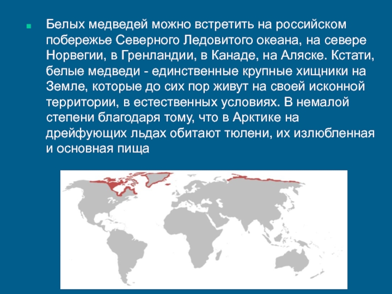 севере Норвегии, в Гренландии, в Канаде, на Аляске. Кстати, белые медведи - единственные крупные хищники на Земле, которые до сих пор живут на своей исконной территории, в естественных условиях. В немалой степени благодаря тому, что в Арктике на дрейфующих льдах обитают тюлени, их излюбленная и основная пища