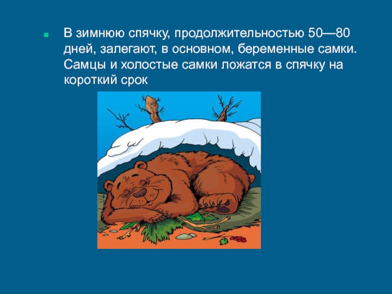 В зимнюю спячку, продолжительностью 50—80 дней, залегают, в основном, беременные самки.