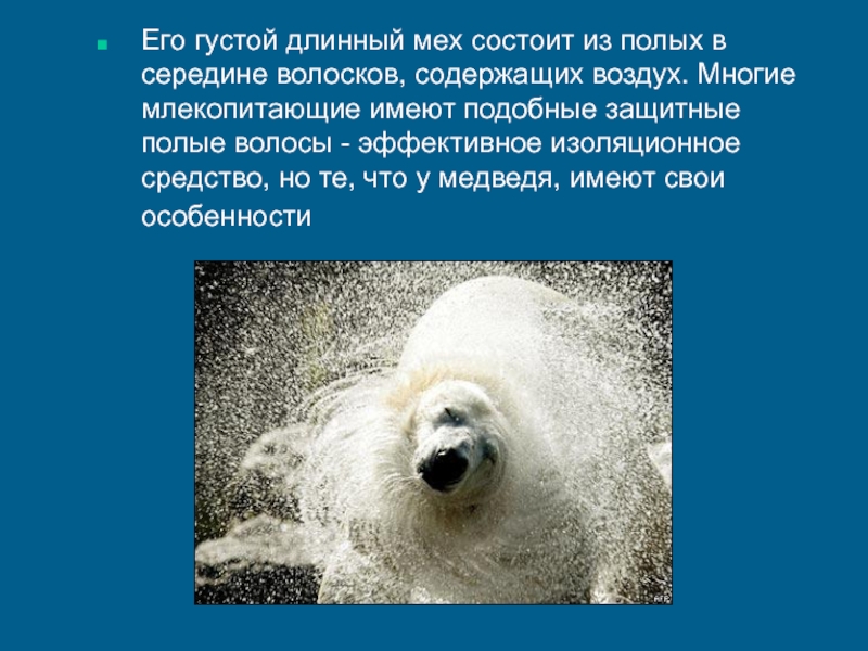 Слайд 14Его густой длинный мех состоит из полых в середине волосков, содержащих