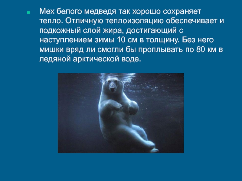 Слайд 15Мех белого медведя так хорошо сохраняет тепло. Отличную теплоизоляцию обеспечивает и