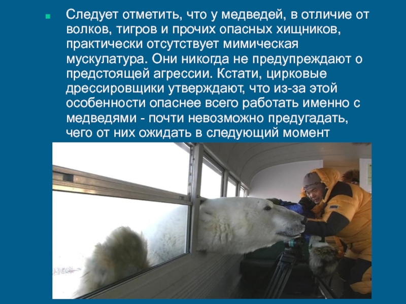 прочих опасных хищников, практически отсутствует мимическая мускулатура. Они никогда не предупреждают о предстоящей агрессии. Кстати, цирковые дрессировщики утверждают, что из-за этой особенности опаснее всего работать именно с медведями - почти невозможно предугадать, чего от них ожидать в следующий момент