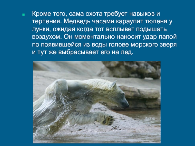 тюленя у лунки, ожидая когда тот всплывет подышать воздухом. Он моментально наносит удар лапой по появившейся из воды голове морского зверя и тут же выбрасывает его на лед.