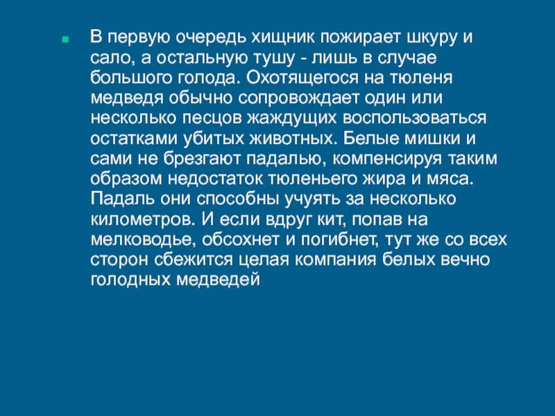 Слайд 8В первую очередь хищник пожирает шкуру и сало, а остальную тушу