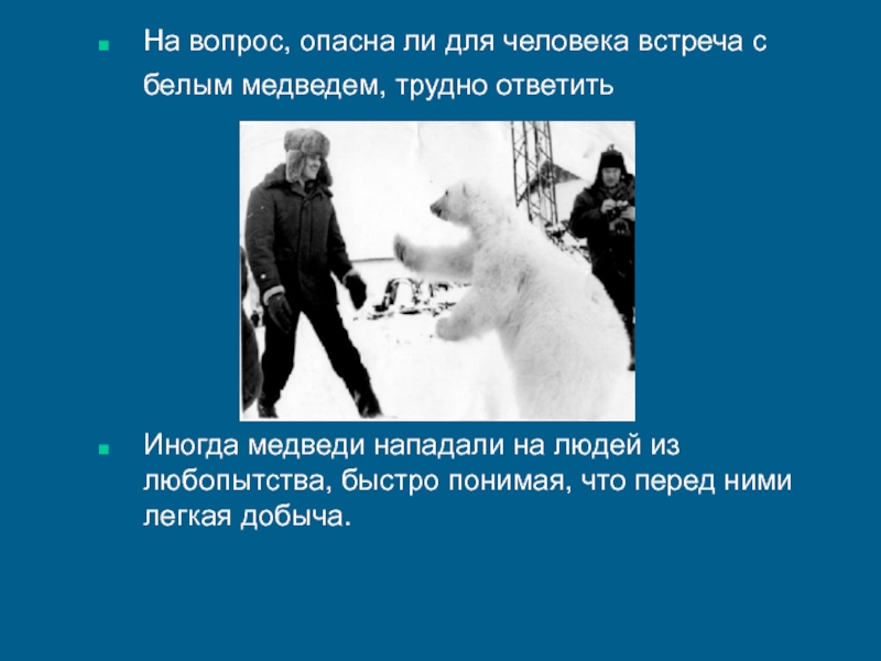 Слайд 17На вопрос, опасна ли для человека встреча с белым медведем, трудно